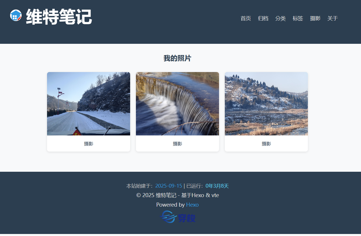 <!-- 照片容器:Flex响应式布局,复用主题卡片样式 --> <div class="photos-grid" id="unsplash-photos"> <!-- 加载中提示 --> <div class="loading-tip" style="width: 100%; text-align: center; color: var(--dark-color); font-size: 1em;"> 正在加载我的照片... </div> </div> </div>