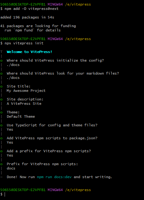 当看到Done! Now run npm run docs:dev and start writing.这段话的时候,vitepress就在自己的电脑里安装成功了。